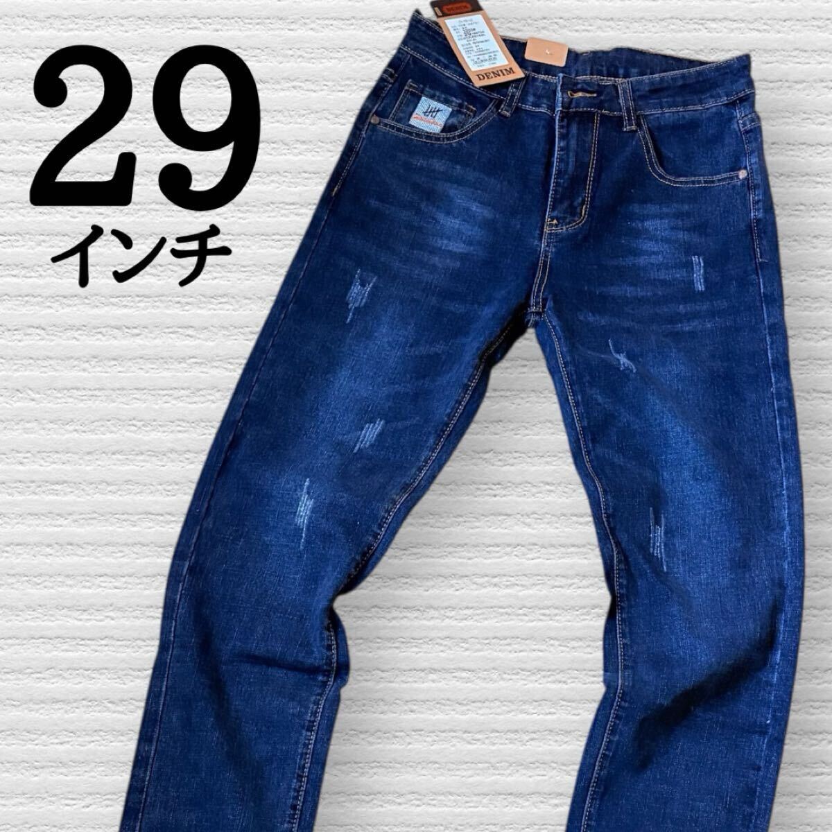 - 新品 デニム 29インチ ダメージ 加工 カジュアル ストレート ブルー インディゴ