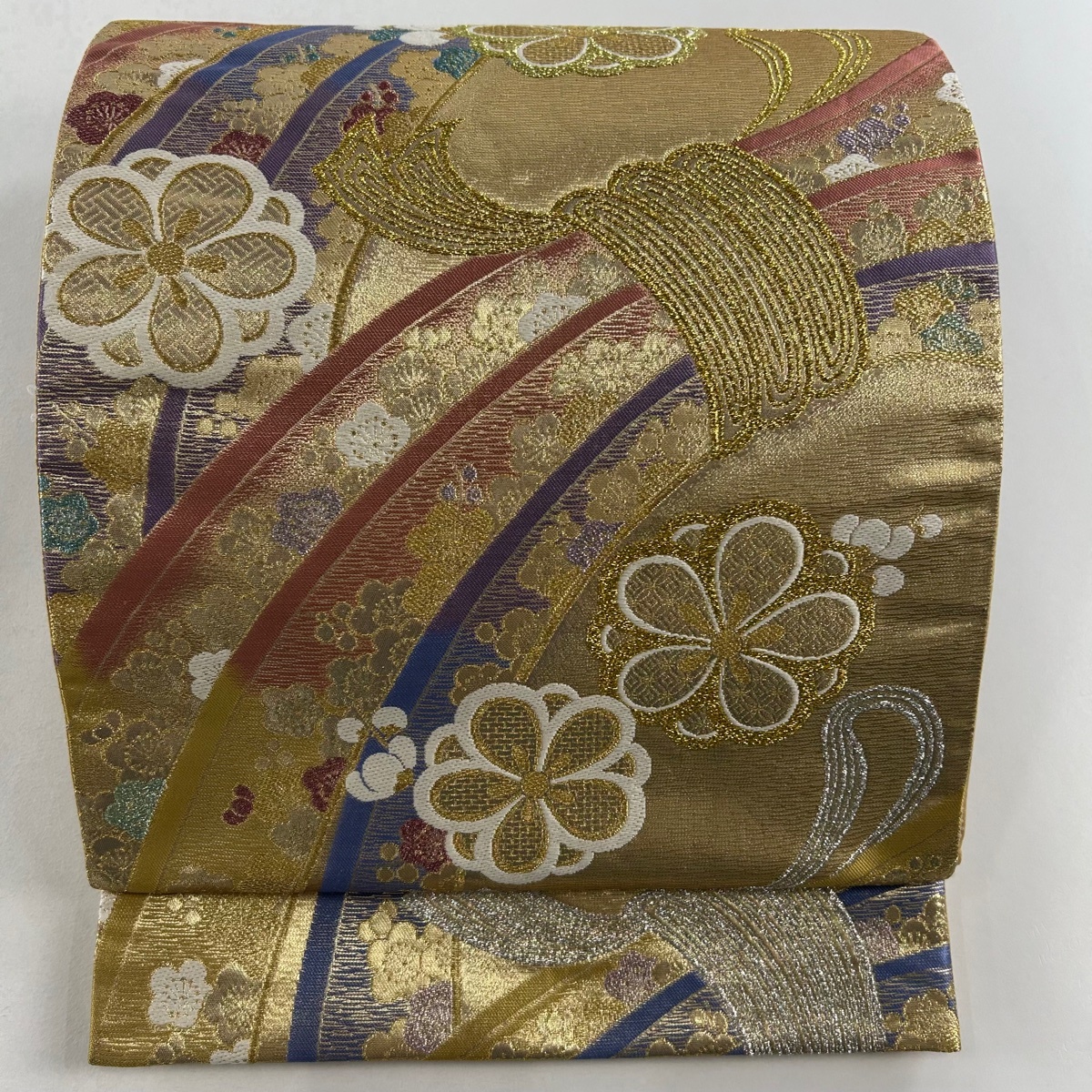 > 袋帯 美品 秀品 束ね熨斗 梅 箔 金色 六通 正絹 【中古】