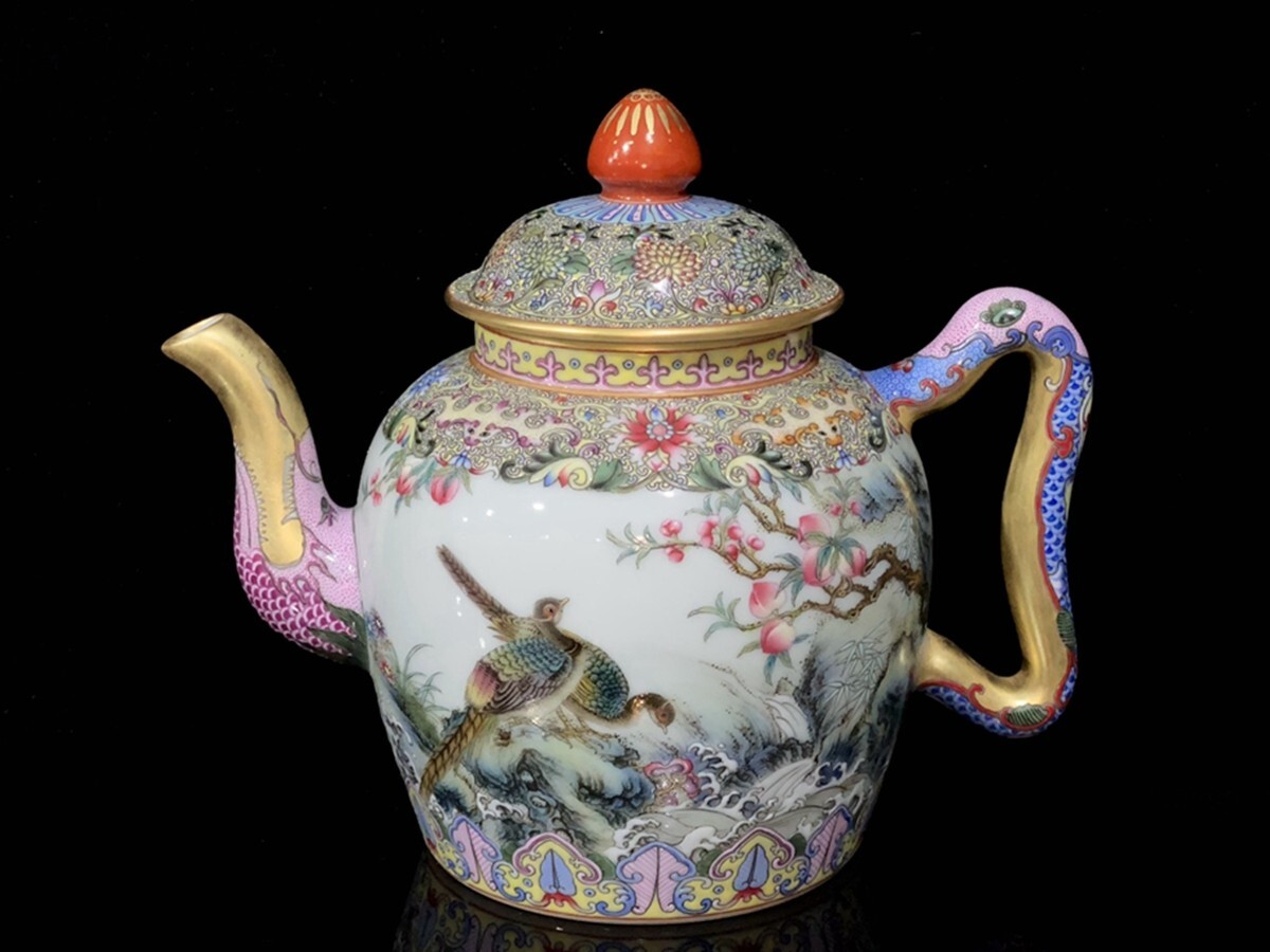 > 「清 乾隆年製 陶磁器 古月軒福壽辺 錦鶏福壽題詩通景 龍頭描金壺」染付 置物 擺件 古賞物 中国古美術 旧蔵出