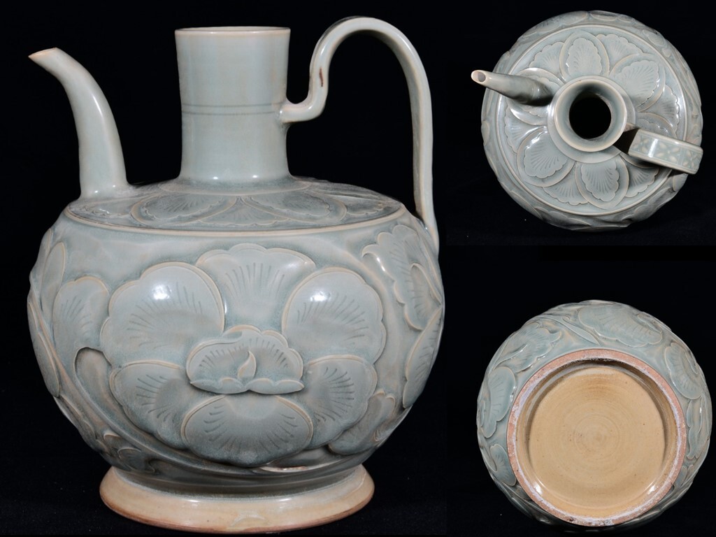 - TX119■晋唐・越窯・秘色釉・耀州窯 青磁刻纏枝牡丹花卉紋執壺 時代物 古玩 唐物 古陶磁器■