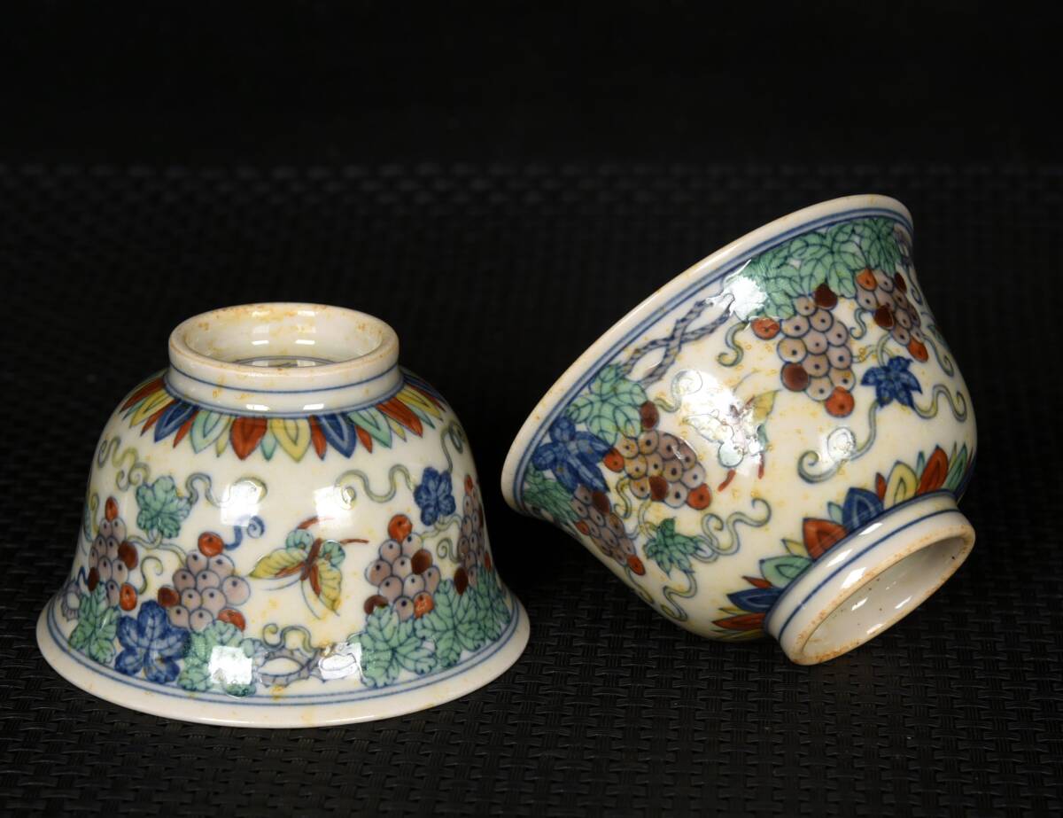 - NA123■大明成化年制款 紅胎 闘彩 葡萄紋杯一対 時代物 古玩 唐物 古陶磁器■
