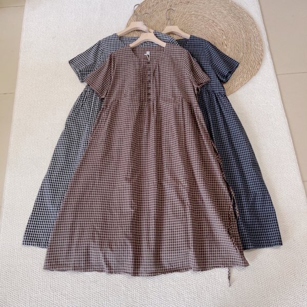 > lh 0708 ワンピース Aライン フリーサイズ チュニック ナチュラル 綿100% 大人可愛 チェック柄 サラサラ 半開け 茶色系