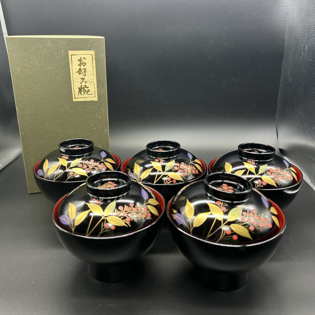 - 会津塗 本漆塗 黒内朱 南天 高台 雑煮椀 吸物椀 漆器 和食器 エ10