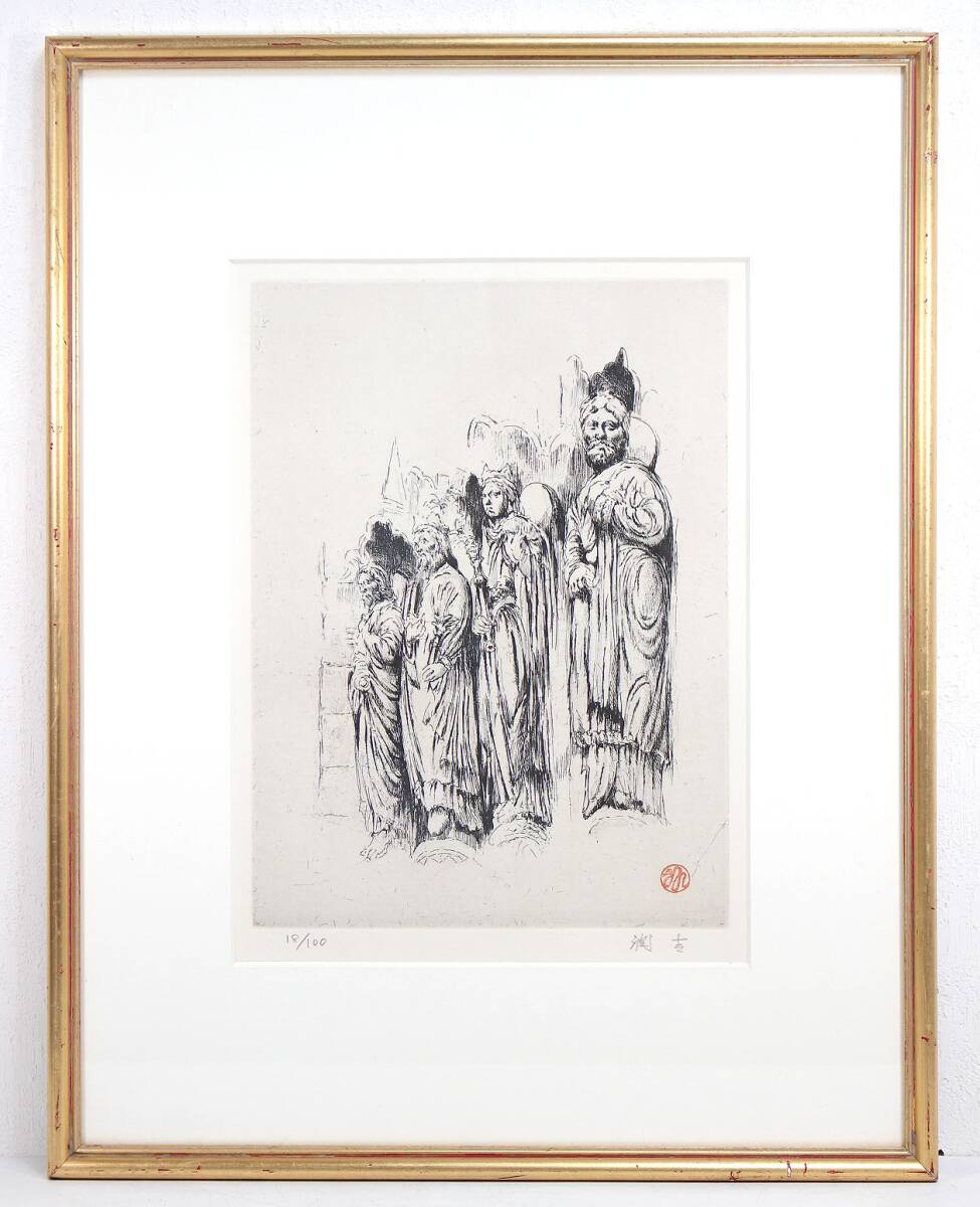 - 【真作】 向井潤吉 銅版画 『石彫聖人像』 直筆サイン エディションナンバー 18/100 額装 額寸/約54×42cm