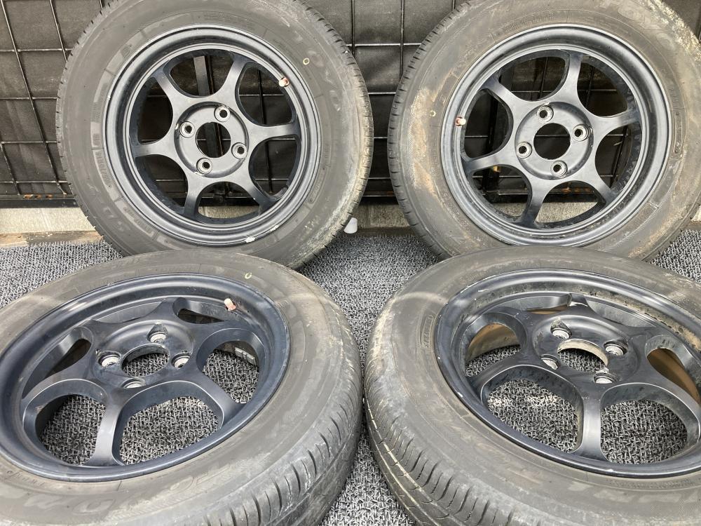 - メーカー不明アルミホイール 165/70R14 リム径14(F/R) リム幅5J(F/R) オフセット45(F/R) PCD100(F/R) 4H ハブ径6.6(F/R)