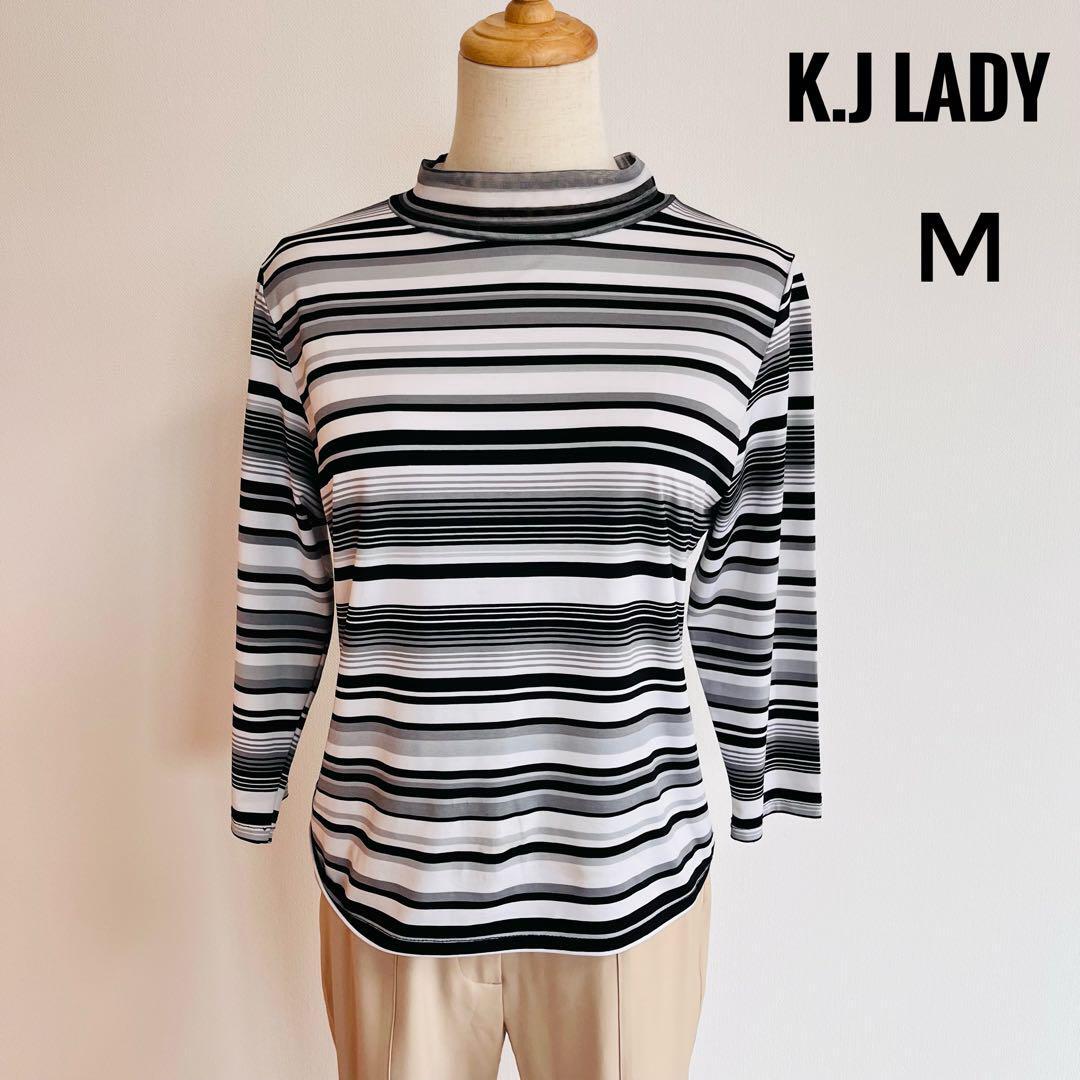 - K.J lady レディース 七分袖 Tシャツ メッシュネック 吸汗速乾 ボーダー M モノトーン