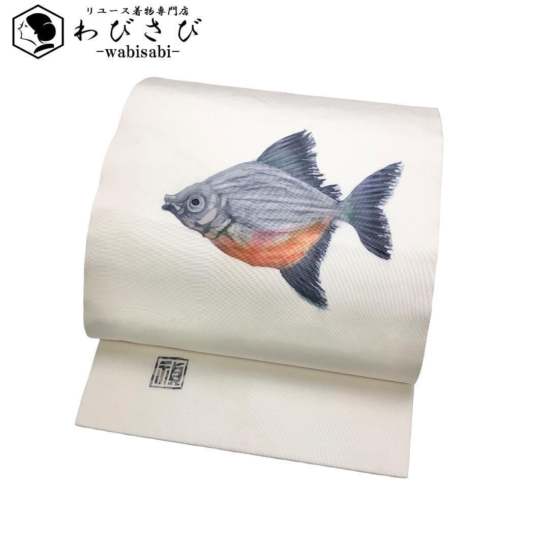 - 名古屋帯 塩瀬 作家物 手描き 魚柄 乳白色 O-5289 着物 きもの kimono 和服 和装 中古 リサイクル着物 【送料無料】