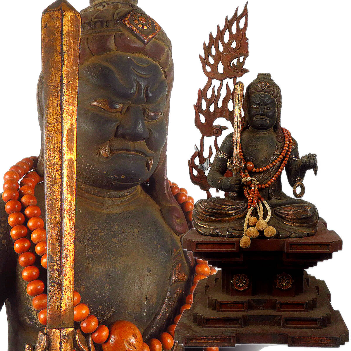 > 【SAKURAYA】九州某寺院整理品【彩色木彫 不動明王坐像】細密彫刻 仏像 佛像 寺院 仏閣 骨董品 古美術品 時代物 高さ64.5cm