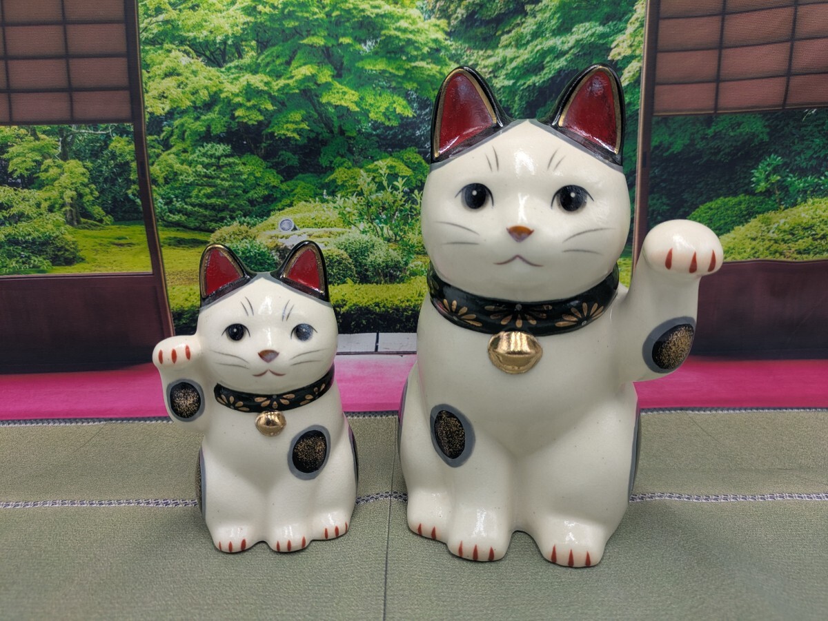 - 招き猫 陶彩菊花招き猫 緑右手上げ小 緑左手上げ大 2種セット 薬師窯