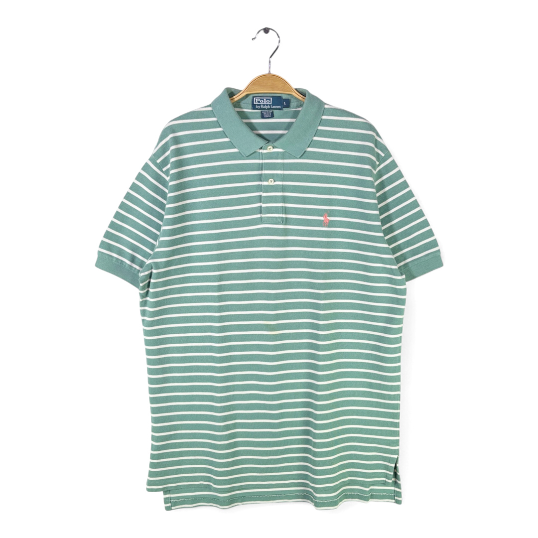 > 【送料無料】ラルフローレン ポロシャツ 鹿の子コットン アクアマリン ボーダー ワンポイントロゴ RALPH LAUREN 青緑 メンズL 古着 @CC9012