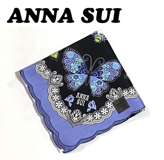 > 【ANNA SUI 】(NO.9188)アナスイ 大判プリントハンカチ バタフライ柄 ブルー系 スカーフにも 未使用 56cm
