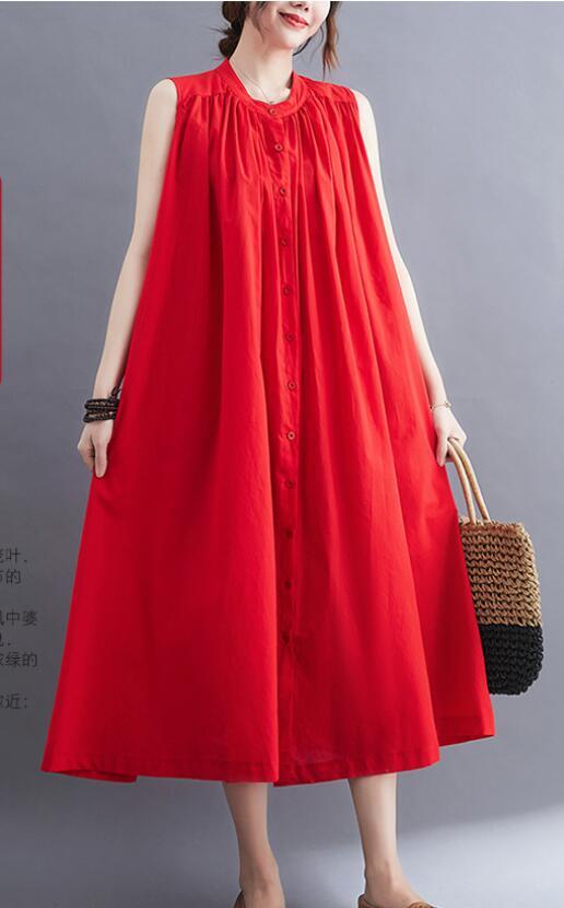 - 大人気森ガール ワンピース 麻混 リネン混 涼しい 無地 綿麻 ワンピース ノースリーブ ロングワンピース 大人 Aラインワンピース レッド