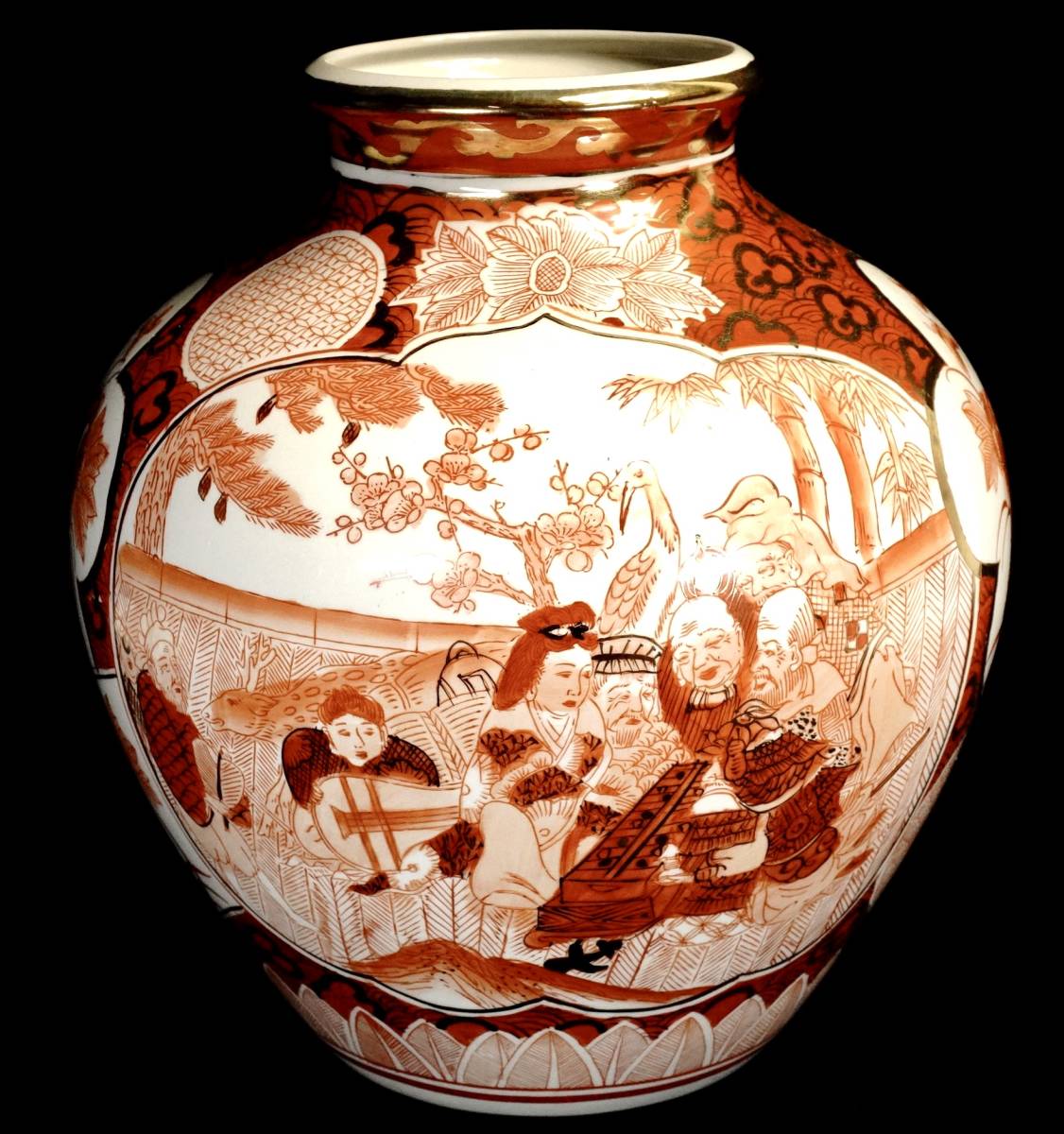 - 昭和ビンテージ 九谷焼 金彩赤絵花瓶 飯田屋風 直径25㎝ 高さ28㎝ 窓絵に描かれた細密かつ美しい 七福神・風景図・花蝶紋が素晴らしい TKM