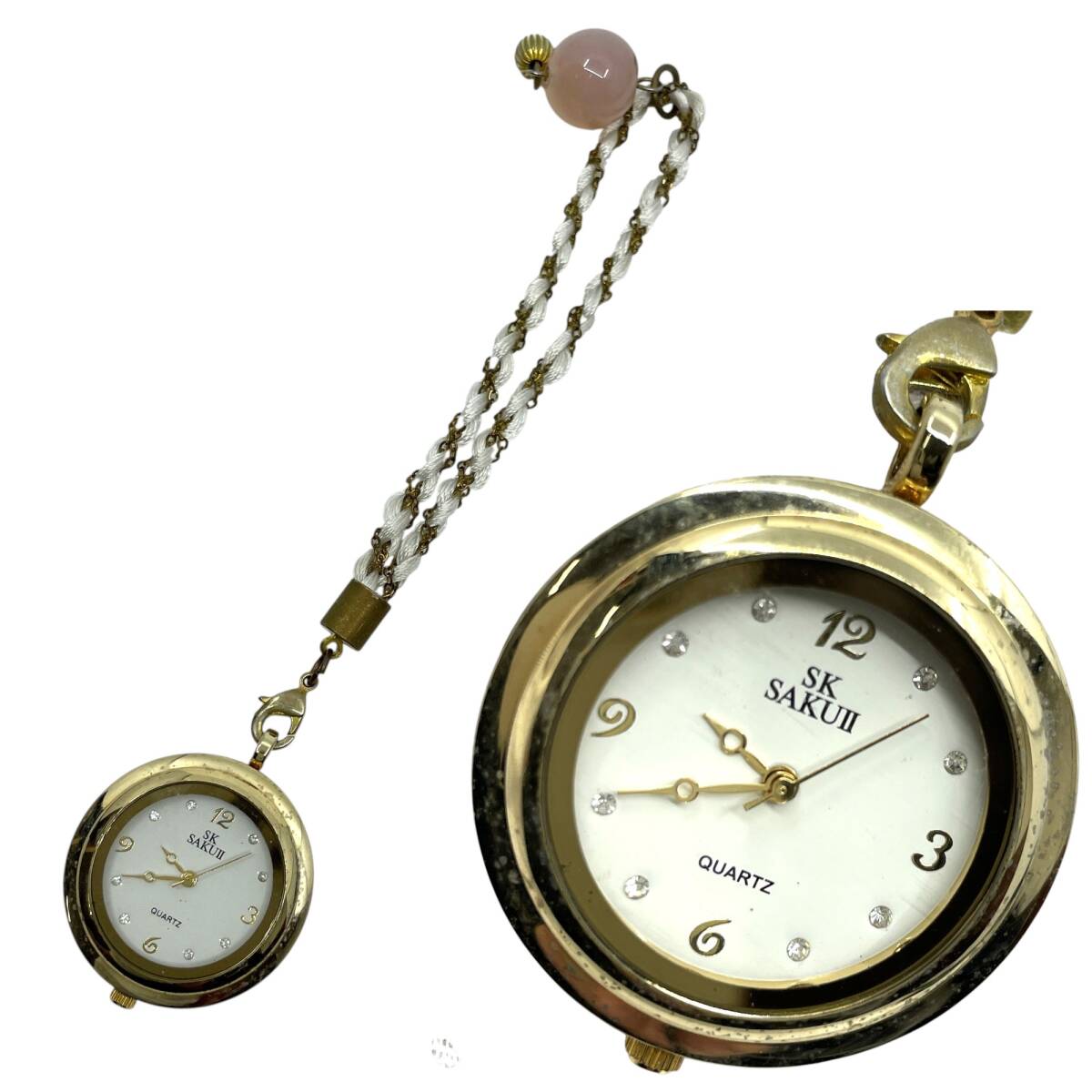 - 【動作未確認】SK SAKUⅡ クォーツ 懐中時計 白文字盤 3針 8P ラウンド 背面シェル ケースゴールド ストラップホワイト系