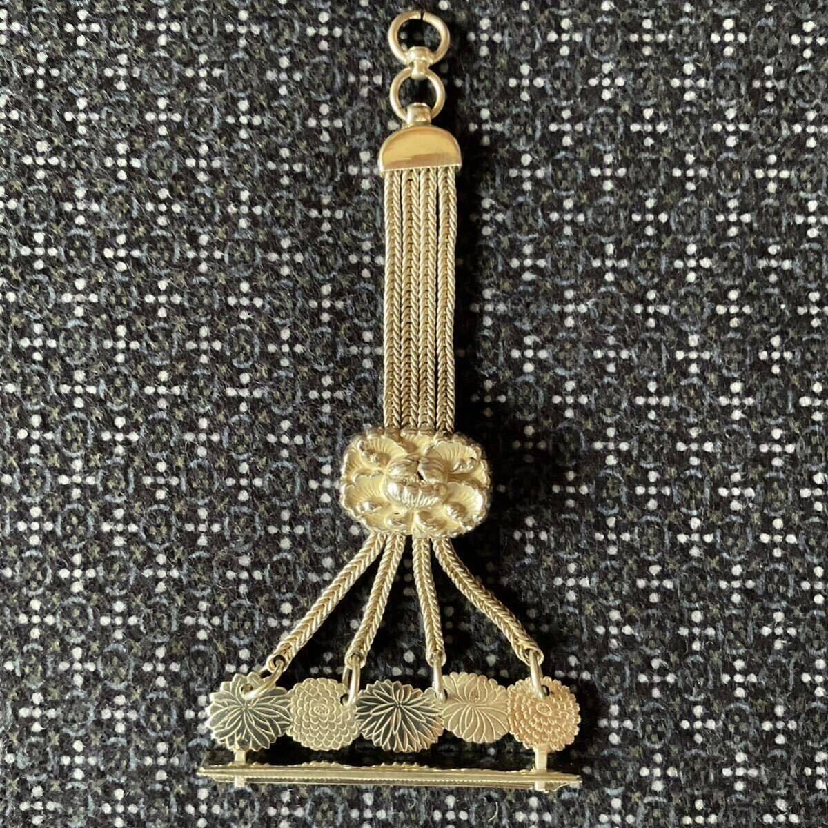 - 時代物 蔵出し【華柄彫金細工金具 鍍銀 煙草入れ 提げ物 根付 四連鎖金具 彫刻金具】
