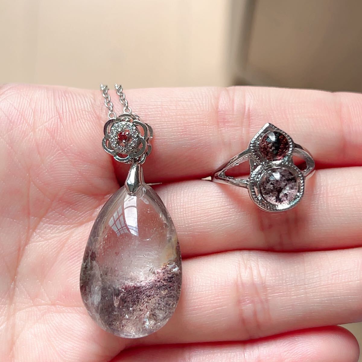 > 2点セット◇高い透明度◇ガーデンクォーツ(庭園水晶)◇ネックレスペンダント+リング◇パワーストーン◇天然石◇巾着袋付◇039S8134