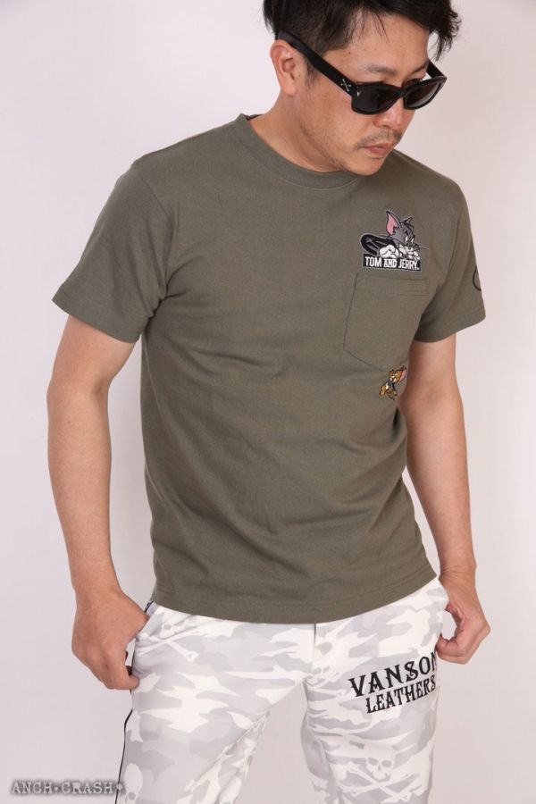 > バンソン VANSON トムとジェリー コラボ 半袖 Tシャツ アーミーグリーン【XXLサイズ】TJV-2023 TOM AND JERRY 刺繍 アメカジ