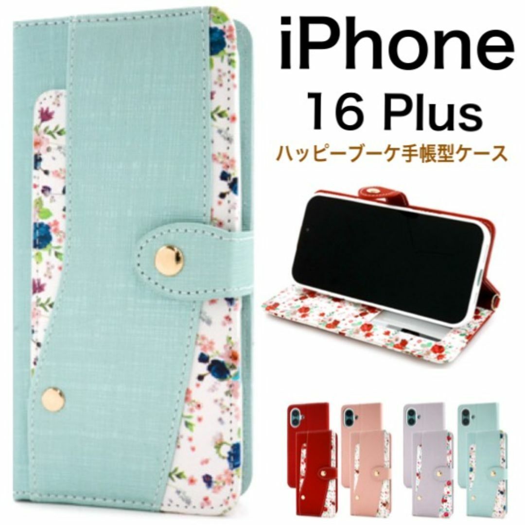 - iPhone 16 Plus用 ポケット付きハッピーブーケ手帳型ケース/アイフォン スマホケース