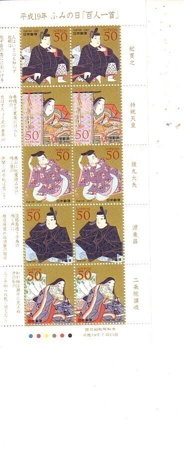 - 「ふみの日「百人一首」平成19年」の記念切手です