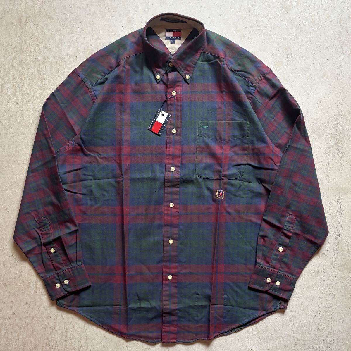 - 【Dead Stock】90s TOMMY HILFIGER トミーヒルフィガー ボタンダウン 長袖シャツ メンズ M 赤/RED チェック ロゴ 刺繍 vintage 正規 新品