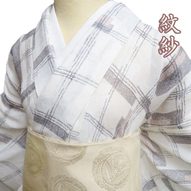 > 夏物 夏着物 小紋 着物 中古 正絹 紋紗 格子模様 花模様 オフホワイト 鼠色 多色 身丈166.5cm 裄69cm L トール きもの北條 A1255-6