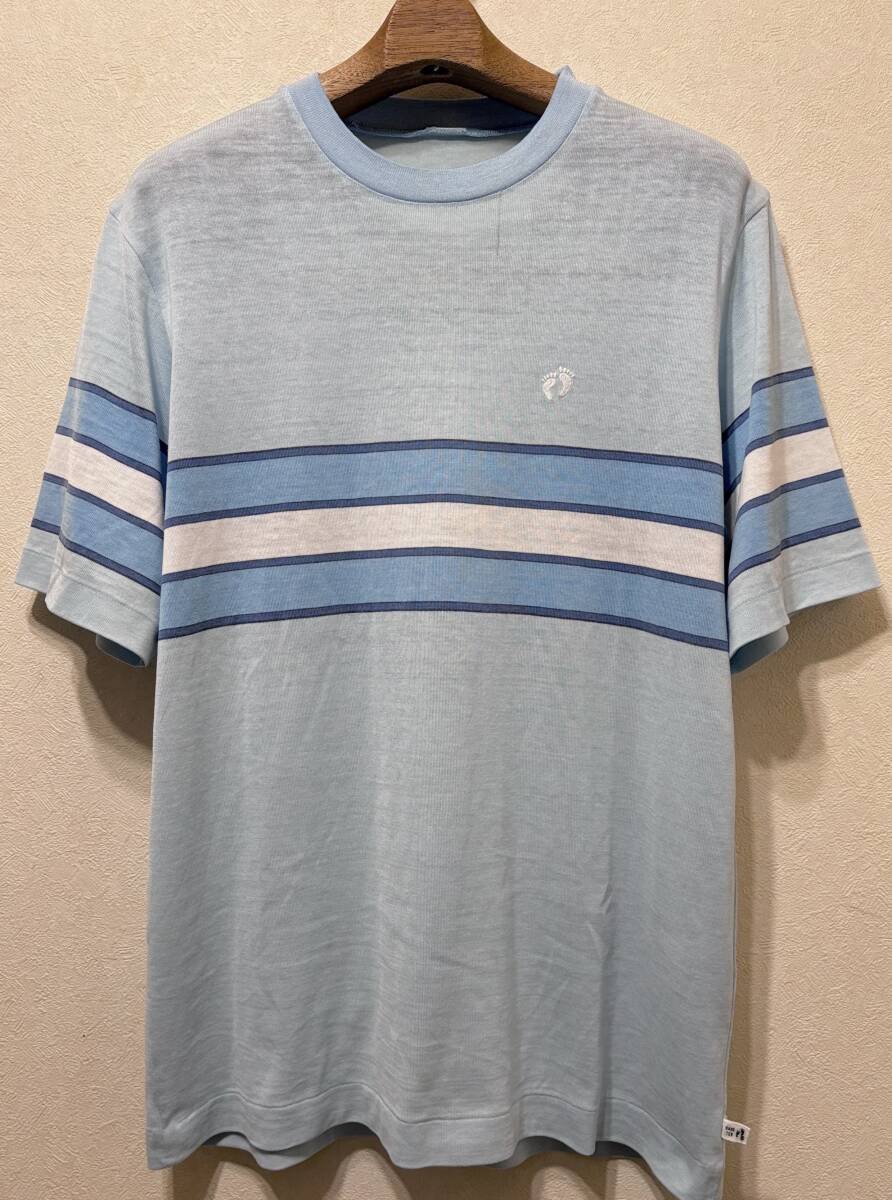 > USA製?70sビンテージHANG TENボーダーTシャツM寒色系サックス切替ブルー刺繍ワンポイント速乾ポリ袖/裾シングル70年代1970sハンテンHANGTEN