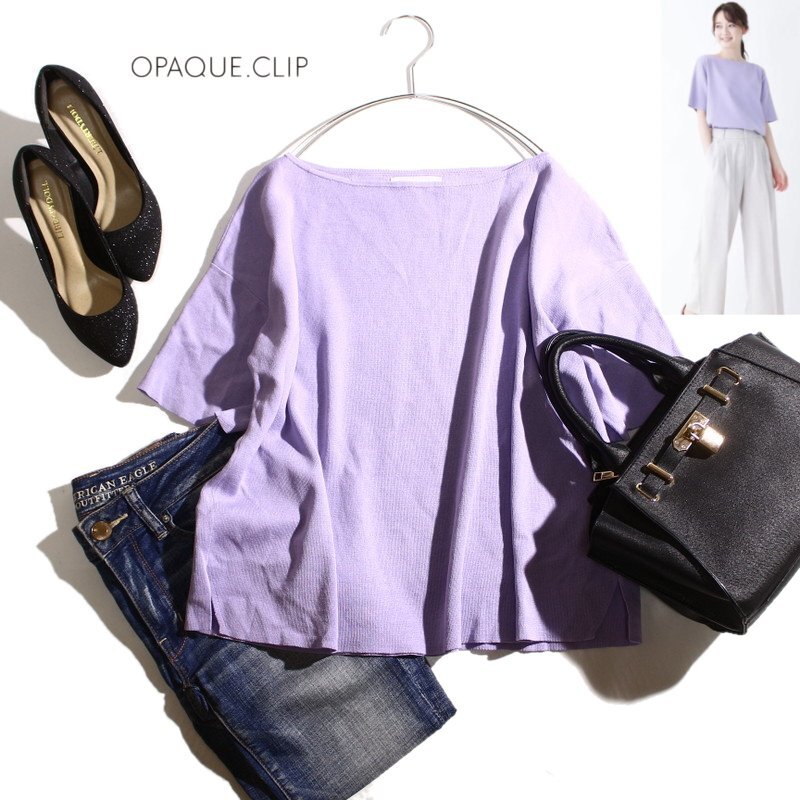 - 美品 オペ―ク ドットクリップ OPAQUE.CLIP 株) ワールド 夏 きれい色 コットン アセテート ボートネック ニットカットソー ラベンダー 紫