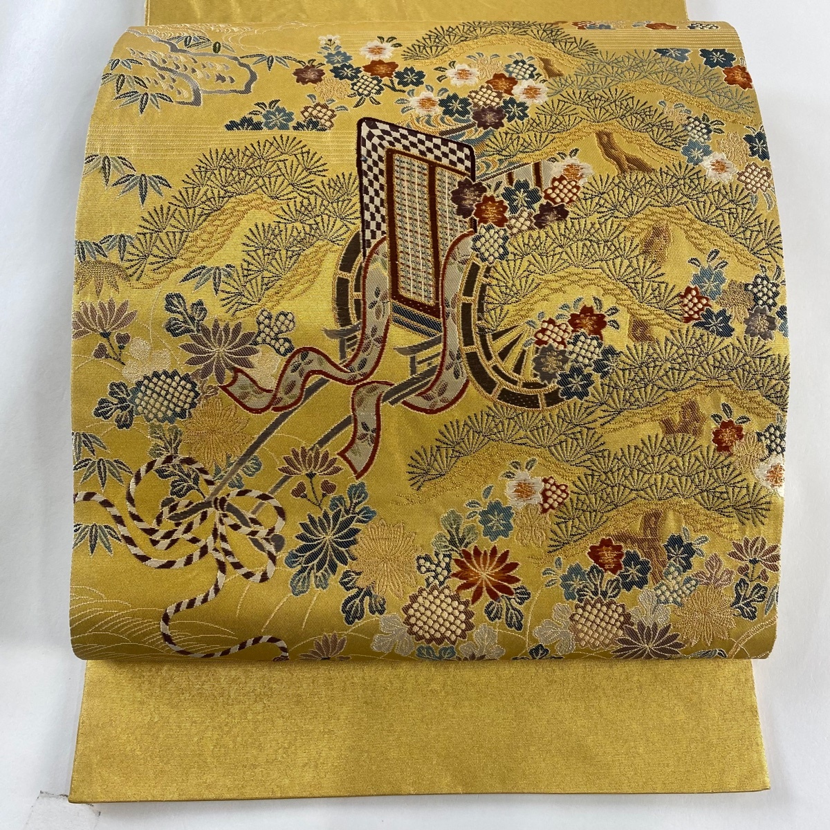 - 袋帯 秀品 熊谷好博子 落款 御所車 草花 金糸 箔 金色 お太鼓柄 正絹 【中古】