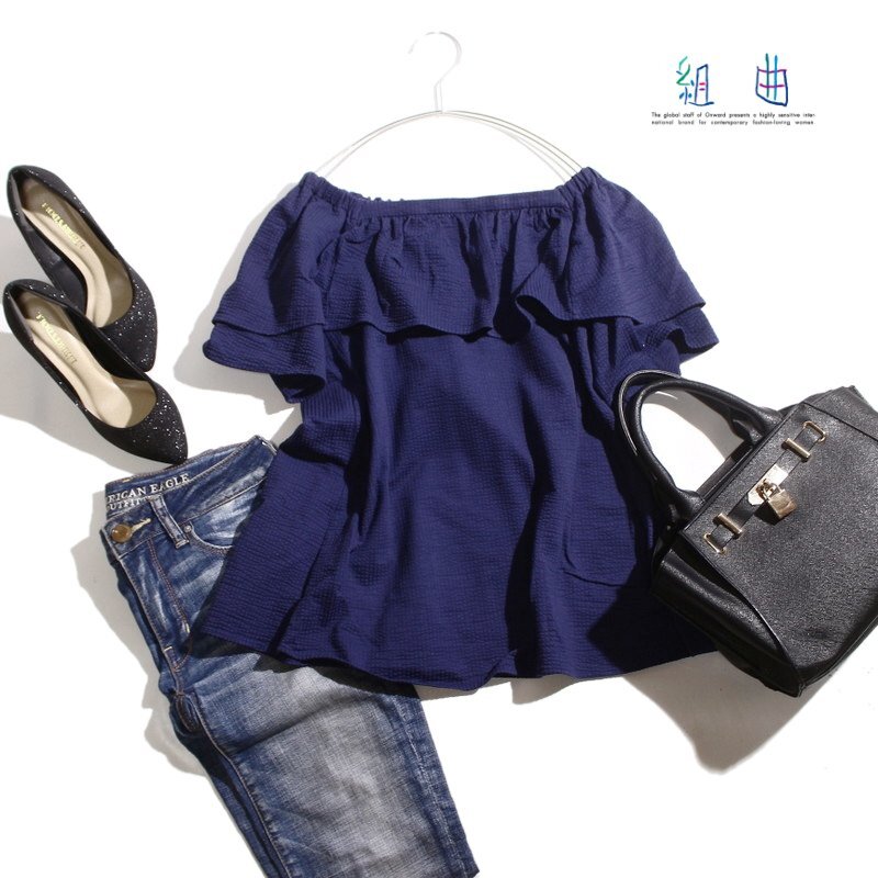 - 美品 組曲 クミキョク 株) オンワード樫山 夏 凸凹 格子 柄 ワッフル フリル オフショルダー カットソー 9号 2 ネイビー 紺 ミセス 可愛い