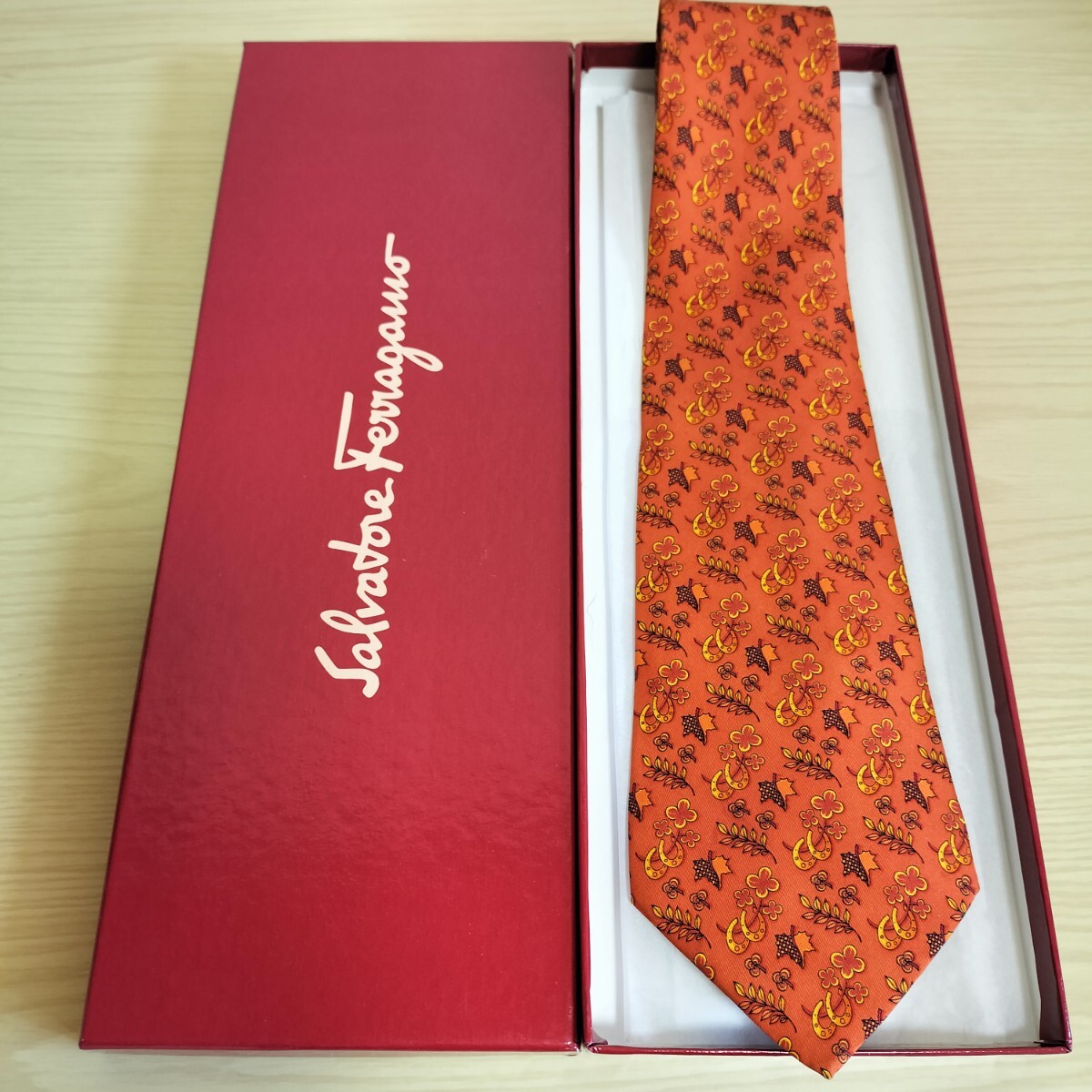 - Salvatore Ferragamo(サルヴァトーレフェラガモ)オレンジ色んな葉っぱ模様ネクタイ