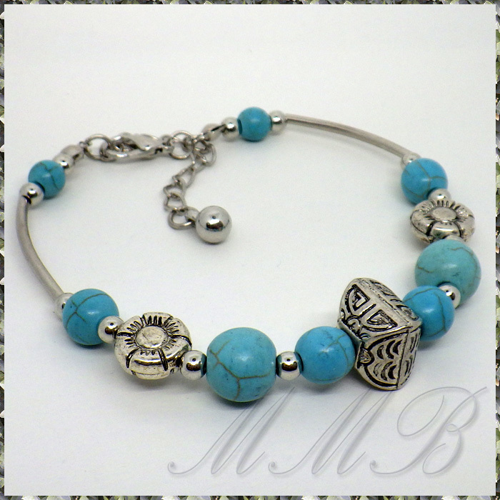 > [BRACELET] ターコイズブルーストーン ヴィンテージシルバーカラー 四角チャーム エスニック デザイン ブレスレット
