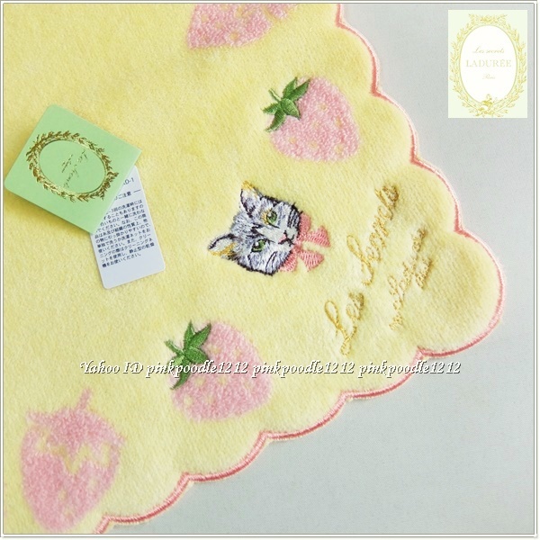 - ◆ラデュレ タオルハンカチ 未使用◆苺柄 猫 刺繍入り イエロー◆