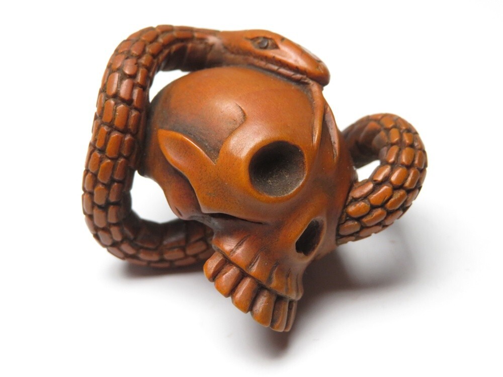 - 【11421】明治期 堤物 木製 髑髏に蛇 骸骨 置物(初品・買取品)