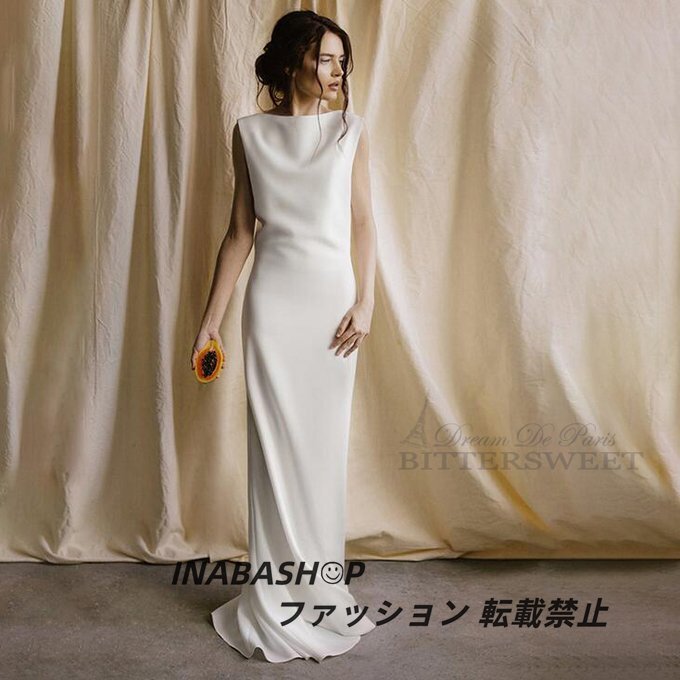 - ノースリーブ ウェディングドレス スレンダーライン ファスナー トレーン 前撮り 後撮り 披露宴 結婚式 演奏会 海外挙式ドレス