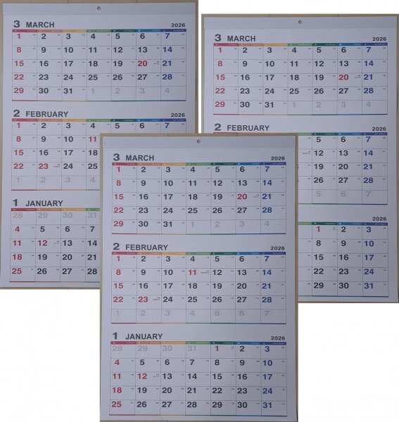 > 【送料無料:3冊 大判 特大 3ヶ月 カラー 大きい カレンダー:A2:62x42cm】★2026年:3ケ月が見える:見やすい★No2:3カ月:3ケ月:3ヵ月