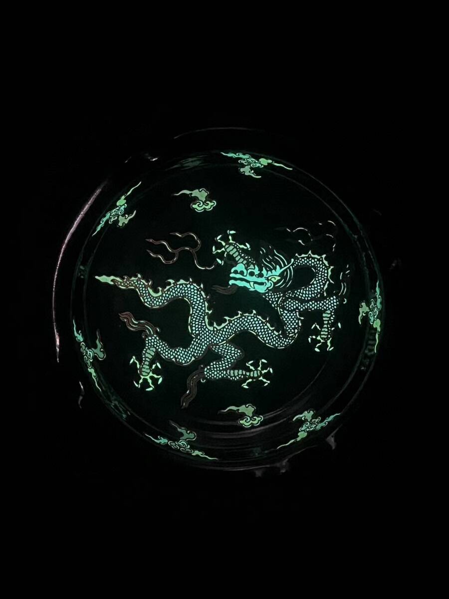 - 宋時代 唐物 黒汝窯 蒔絵金 夜光龍紋盤 陶磁器 中国美術 古美術 置物 高さ4.5 cm 直径20.5 cm 820