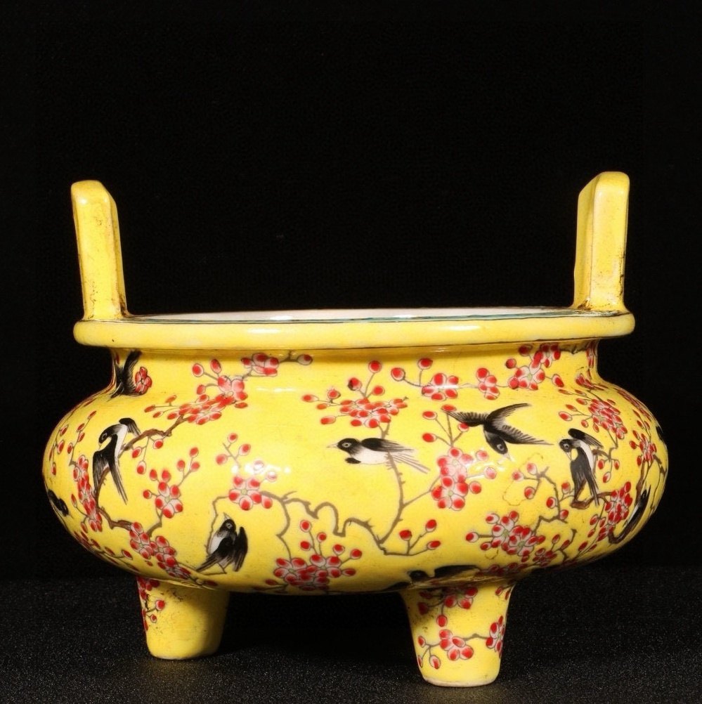- 時代旧蔵 清時代 乾隆年製 黄釉粉彩 喜上眉尻 三足炉 古陶磁器 珍品旧蔵 古賞物 時代物 820