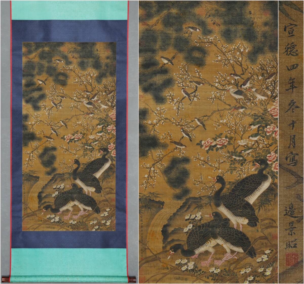 - 古美術 掛け軸 中国・明時代 「辺景昭書」 絹本 【林間百鳥図】 立軸 書道 巻き物 肉筆保証 唐物 古画 画心130x65cm LT-250854