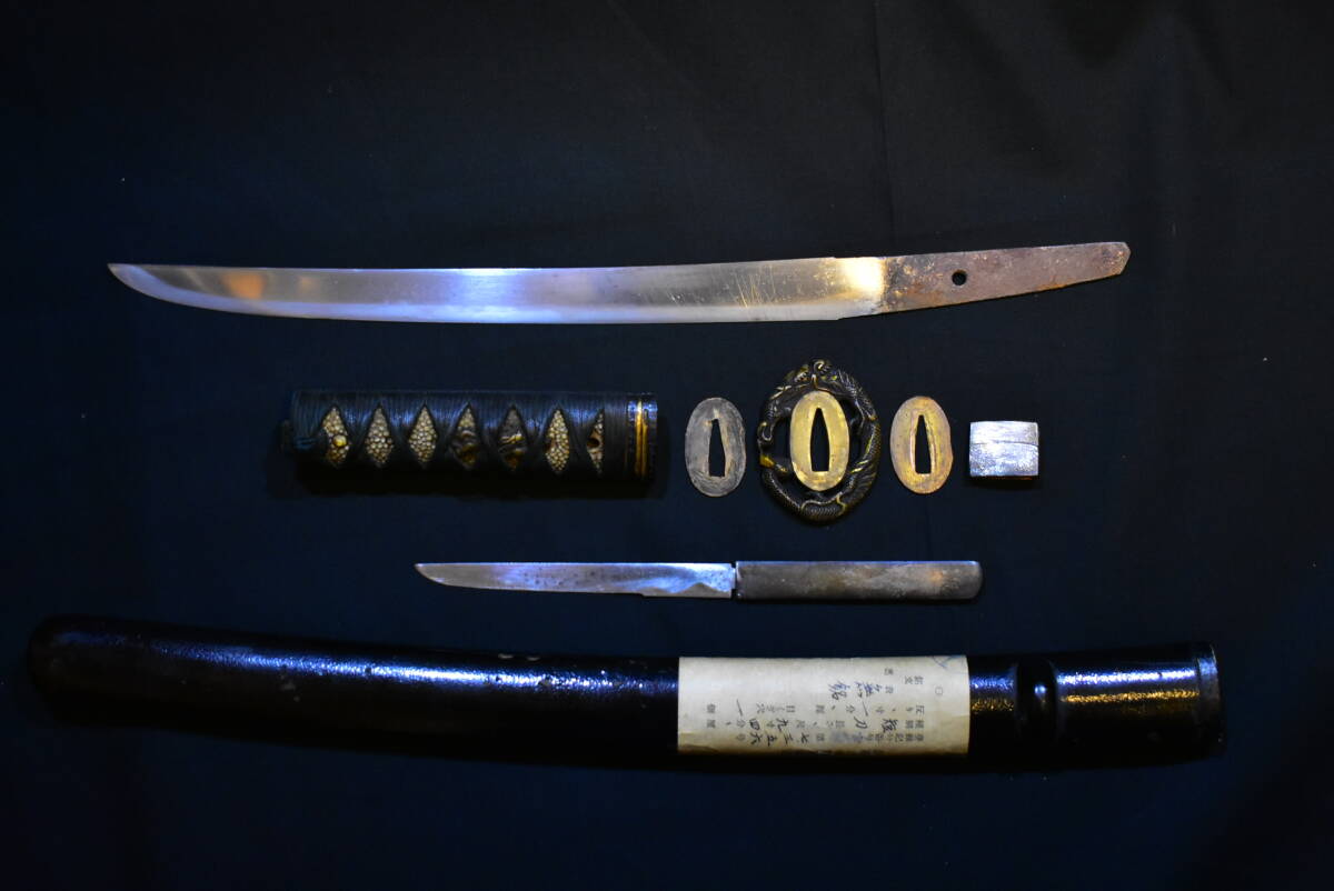 日本刀 短刀 無銘 拵 透かし彫り銅鍔 小柄 刃渡り28.5cm 176.5g 骨董 古美術 当時物