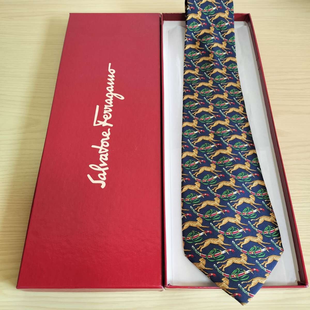 - Salvatore Ferragamo(サルヴァトーレフェラガモ)紺チーター剣模様ネクタイ