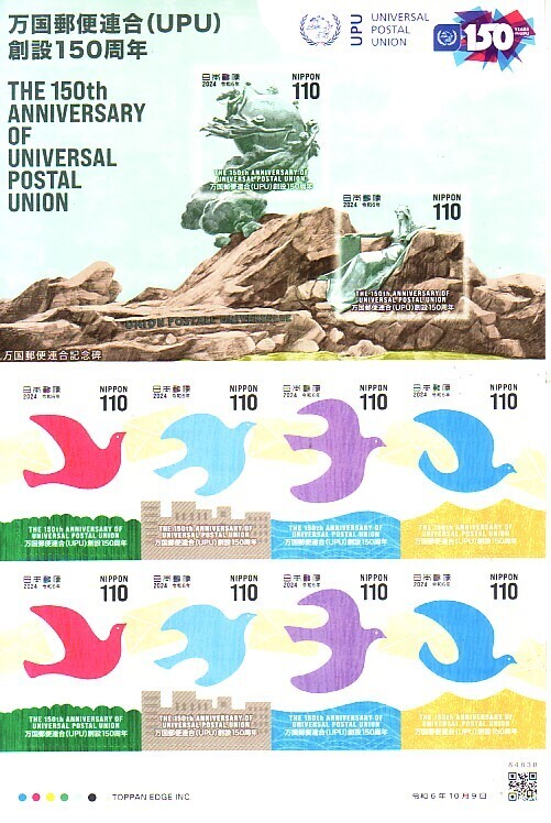 - 「万国郵便連合加盟150年記念」の記念切手です