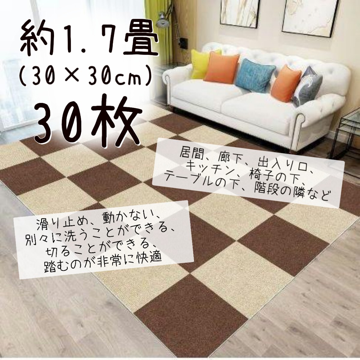 > ジョイントマット 吸着 大判 タイル カーペット フローリング 30*30cm 30枚 約1.7畳 ずれない 防音 洗える ペット 高齢者 滑り止め 厚さ4mm