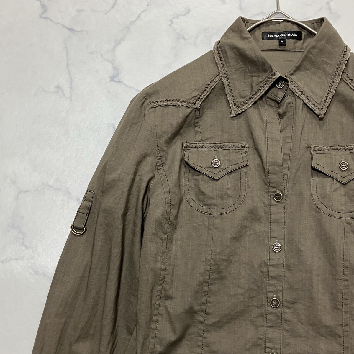 > BUONA GIORNATA ボナジョルナータ ステッチ カットオフ デザイン ポケット 長袖 ラウンドカット ウエスタン シャツ カーキ M