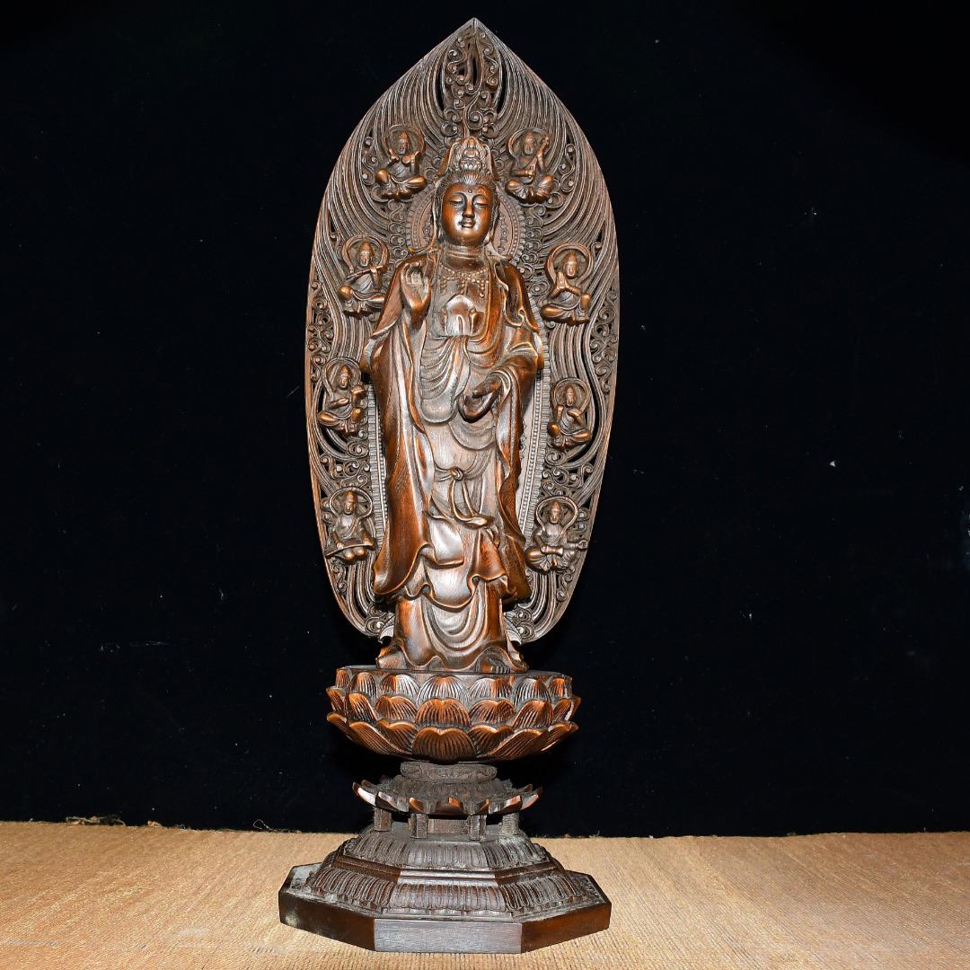 > 8+GV7346「東洋美術」 人間国宝 中国骨董 木製 工芸品 木彫り 時代物 賞物 【小葉ツゲの背もたれ観音飾り】 書道具 文房具 収蔵価値が高い