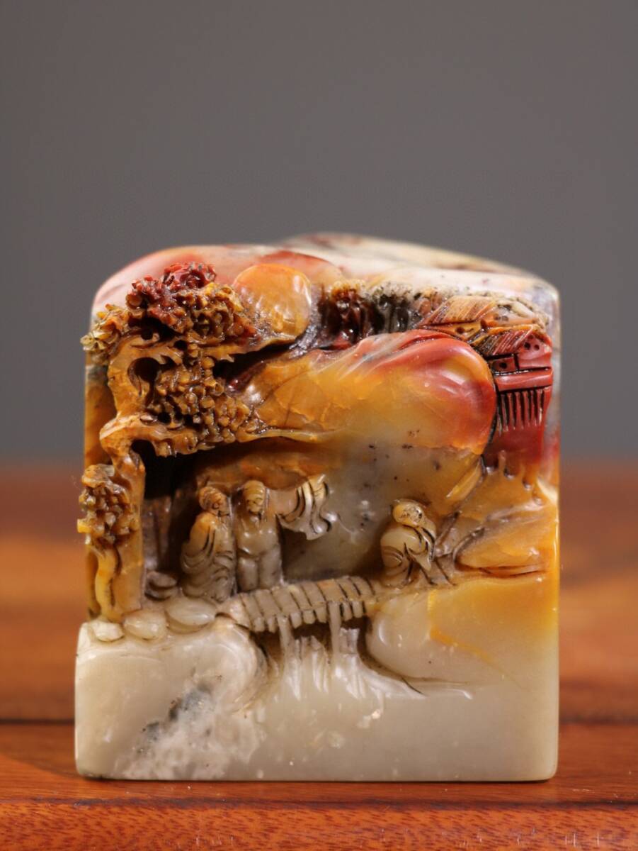 - 『館蔵珍品 寿山石 芙蓉石 細密彫 攜童訪友印章 印章 印鑒』文房具 書道品 貴重物品 収蔵品 中国古美術 時代物 古董品