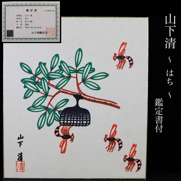 > ◇雅◇ 真作保証 山下清「はち」色紙 色ペン画 山下清鑑定会鑑定書付 人気作品 蜂 4匹 蜂の巣 肉筆 額装 箱付 /YS.25.5 [J102] PTQ