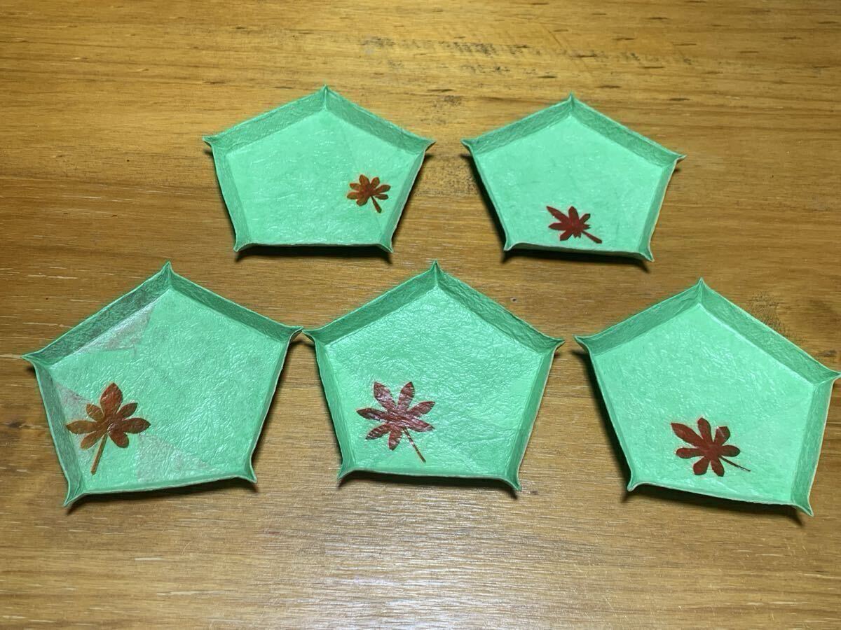 - 和紙銘々皿 5枚セット もみじ 五角形 菓子皿 グリーン 緑 ペーパークラフト 紅葉 ハンドメイド 軽量 紙製 和紙皿 銘々皿 茶器 茶道