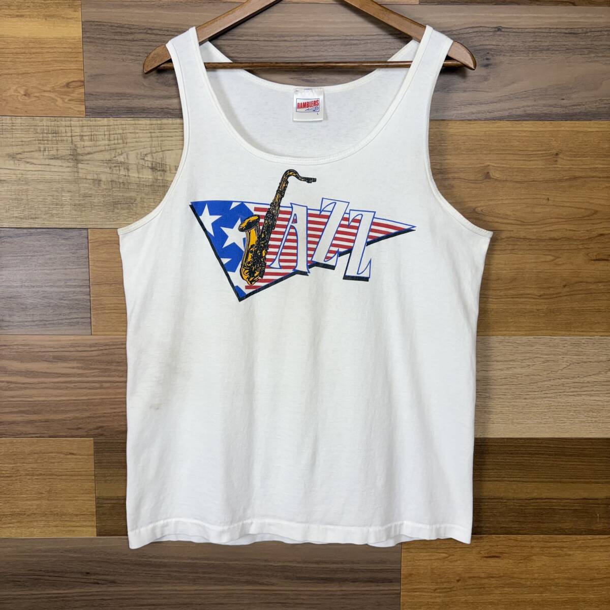 - 90s RAMBLERS JAZZ プリント タンクトップ サイズ メンズ L 裾シングルステッチ 90年代 VINTAGE ビンテージ アメカジ 古着 r25082131