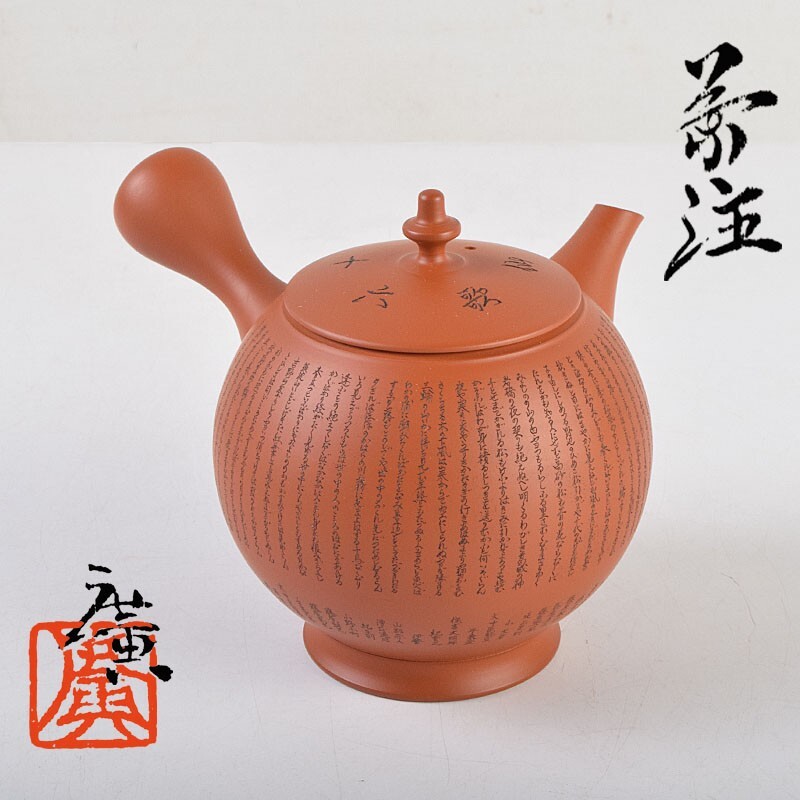 - 煎煎茶道具 常滑焼 玲光窯 鯉江廣作 朱泥 三十六歌仙 和歌彫 茶注 急須 共布共箱 IVXL