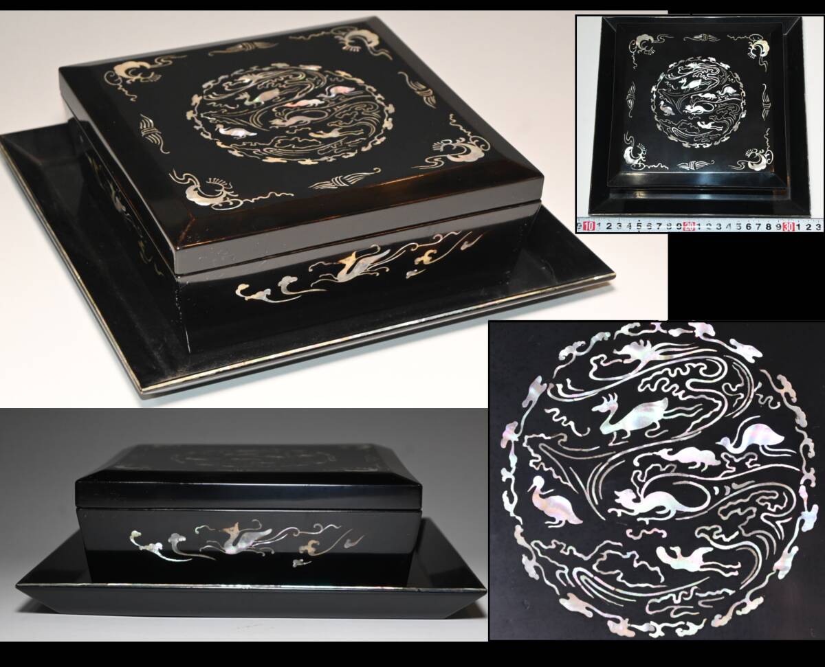 - 朝鮮美術 螺鈿細工 四方箱 盆付 螺鈿漆器 木製箱付 蓋物 螺鈿箱 四方盆 黒漆螺鈿 木製漆器 漆芸 鳥 獣 検:海市商会 京城 李王家